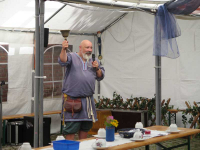 Der Sonntag nach dem Waidfest stand im Zeichen des Rückbaues. Alles das, was in den Tagen zuvor aufgebaut worden war, musste nun abgebaut, in Kisten verpackt und dann untergebracht werden. Erstaunlich dabei ist immer, dass der Abbau sehr viel schneller geht. Innerhalb weniger Stunden war der Hof des Bürgerhauses aufgeräumt und auch vor dem Museum war vom Färberstand nichts mehr zu sehen.