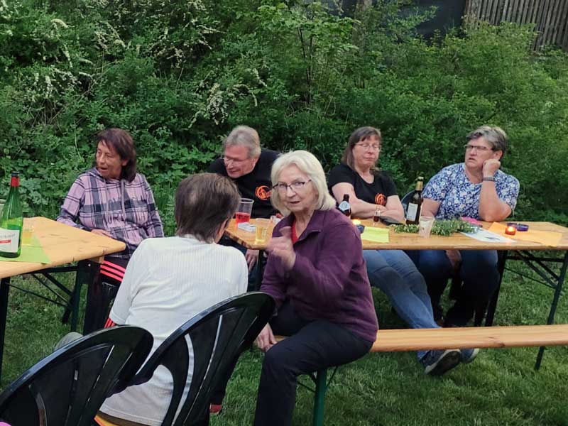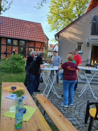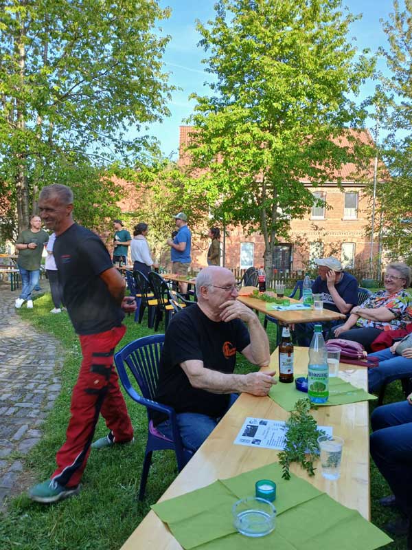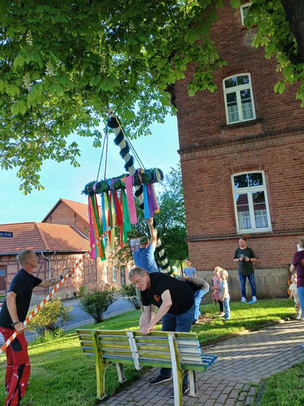 Immer am 30.04.2025, dem Vortag zum 1. Mai wird in Hochstedt der Maibaum aufgestellt. Dafür hatten wir bereits vor einigen Tagen den Kranz gebunden und auch sonst alles vorbereitet. Immerhin geht es dabei auch immer um die erste Bratwurst des Jahres bei einer Veranstaltung. Das Wetter spielte im gegensatz zum Kranzbindetag diesmal so gut mit, dass nicht einmal Pavillons aufgestellt werden mussten. Die Sonne schien vom Himmel und stimmte auf den Frühling ein. Im Hof des Bürgerhauses hatten wir Tische und Bänke aufgestellt, wo es sich auch schon bald die ersten Gäste gemütlich machten.