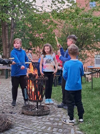 Im Bürgerhaushof feierten nicht nur die Erwachsenen in den Mai hinein, sondern auch die Kinder, die am Feuerkorb Knüppelkuchen für sich backten.