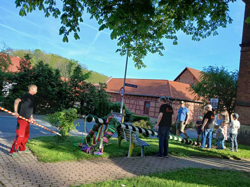 Irgendwann war es dann auch an der Zeit dem Maibaum aufzustellen. Zunächst musste an dessen Spitze noch Birkengrün angebracht werden, aber dann konnte mit dem Aufrichten begonnen werden.