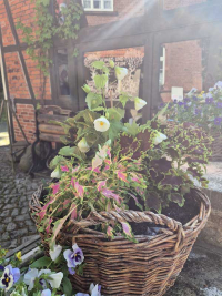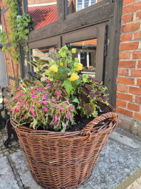 Die Sommerbepflanzung des Jahres am Museum in unseren Pflanzkörben war Mitte Juni in der Planung und wurde am 21. des Monats ausgeführt. Diesmal hatten wir uns eine etwas andere Bepflanzung ausgedacht, nachdem die vom Vorjahr einer Horde marodierender Spatzen zum Opfer gefallen war, denen der Mangold vorzüglich geschmeckt haben muss.