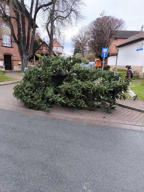 Da viele Hände anpackten, war der zukünftige Weihnachtsbaum auch schnell an Ort und Stelle gebracht. (Danke, Rebecca, für die Bilder bis hierhin!)