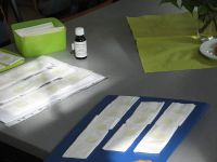 Aber es kam ganz anders als gedacht: Kaffe gab's natürlich vorneweg und dann kam sie, die Kräuterfee im rüstigen Rentenalter. Aber nicht nur sie schneite herein, sondern auch ihr Begleiter, der Kräutermann, im gleichen Alter wie die Fee. Er begann sogleich, mit Unterstützung seiner Fee, etliche Tafeln vor den noch Kaffee-tafelnden Frauen aufzubauen. Die Spannung wuchs ins Unermessliche, als die Fee Papiertaschentücher vor sich ausbreitete und damit begann, diese mit einer Flüssigkeit aus einem kleinen, braunen Fläschchen zu beträufeln.