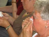 Natürlich gab es für die Nase auch etwas: Die Fee verteilte die mit dem Öl beträufelten Taschentücher und jede der Frauen durfte den Duft des Öls einatmen, indem sie sich das Taschentuch unter die Nase hielt. Hätte man jetzt den Ton abschalten können, hätte man durchaus denken können, es sei etwas passiert und die versammelte Frauschaft würde heulend im Bürgerhaus sitzen.Interessiert schnüffelte man weiter am Tuch, während der Kräutermann berichtete, wie man mit dem Öl Gelenkentzündungen, Zahn-, Hals-, Ohren-, Muskelschmerzen, Husten, Schnupfen, Heiserkeit, Krampfadern, Warzen, Hämorrhoiden, Blasenentzündungen und vieles mehr, sogar Blattläuse bekämpfen kann. Ein Allzweckmittel der Extraklasse klebte den Frauen unter der Nase, das sogar bei der Haarpflege zum Einsatz kommen kann. Lediglich zum Abwaschen taugt das Öl nicht.