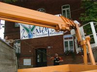 Auch das Ankündigungstransparent wurde zwischen den Kastanienbäumen, vor dem Bürgerhaus, angebracht. Mit einer Hebebühne, die zufällig in der Nähe stand, ging diese Arbeit natürlich sehr viel schneller von der Hand.