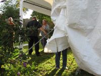 Für das Wochenende hatten die Meteorologen Wetterbesserung vorausgesagt und wir drückten entsprechend die Daumen. Wir hatten uns im Vorfeld dazu entschlossen in diesem Jahr auch die Getränkeversorgung selbst zu übernehmen und hatten deshalb eine Bar aufgestellt, die zusammenlegbar ist und somit bis zur nächsten Veranstaltung aufbewahrt werden kann. Wie die Bar funktioniert musste im Rahmen eines Versuches getestet werden. Dazu wurden einige Getränkeflaschen probehalber geöffnet und auf der Theke abgestellt. Damit diese Getränke nicht verdarben, waren wir gezwungen, diese während des Aufbauprozesses zu trinken.