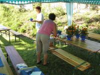 Auf den Tischen standen zum 3. Waidfest keine Töpfe mit Waid, sondern es mussten Studentenblumen als Florale Dekoration herhalten. Der Grund war einfach: Die Waidpflanzen in den Töpfen hatten sich wegen dem ungünstigen Wetter nur zu mickrigen Pflänzchen entwickelt, die zum Schluss auch noch von irgendwelchen Schädlingen löchrig gefressen worden waren. Damit hatten die Studentenblumen eindeutig das Rennen um den Sieg als Tischdekoration gewonnen.