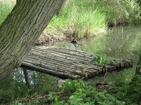 Vom Eingang führte der Weg in eingezäuntem Gelände weiter am See entlang, an dessen Ufer ein Flos festgemacht war. Dieses Wasserfahrzeug wurde extra gebaut, um für Dreharbeiten des ZDF zur Verfügung zu stehen, die hier kurz zuvor eine Dokumentation filmten.