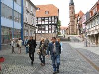 Inzwischen hatte sich draußen, vor dem Rathgaus die Stadtführerin eingefunden, die den noch essenden Hochstedtern noch einige Zeit bewilligte. Unterdessen unterhielt man sich schon einmal über die Stadt und deren Vergangenheit. Da die Kelleresser noch immer nicht aufgetaucht waren begann die Führung mit einem Kurzüberblick über die Lage und mit einigen Geschichten. Auf einem Rathausbalkon stand eine Figur, die einen König darstellte, der eine überdimensionale Möhre im Arm hielt. Auf diese Figur wies die Stadtführerin besonders hin. Zu ihr wollte sie später noch etwas erzählen. Die Gruppe ging die Fußgängerzone hinunter und blieb an einer Straßenkreruzung stehen. Hier war die einzige Stelle, von der aus man alle drei Stadtkirchen einsehen konnte.