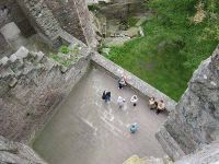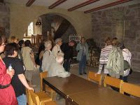 Unser Weg führte weiter um die Burg herum und über eine Brücke, die einmal eine Zugbrücke war gelangten wir in das Innere der BUrg. Dort fanden wir gleich mehrere miteinander verbundene Höfe vor. Von dem hinteren von ihnen gingen mehrere Türen ab, von denen eine in den Rittersaal der Burg, mit Tischen Bänken und einer kleinen Ausstellung zur Burggeschichte führte.