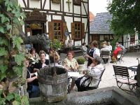 Die Fahrt dauerte nicht lange, etwa 30 Minuten, uind die Burg war schon zu sehen, wie sie hoch oben auf einem Berg über der Landschaft thronte. Der Bus fuhr bis zu einem Gasthof unterhalb des Burgberges, von welchem aus der Aufstieg (laut einem Wegweiser) beginnen sollte. Einigen Hochstedtern war die Aussicht auf einen Anstieg, nach der Herumlauferei in der Stadt und am Opfermoor etwas zu viel, umso einladender fanden sie das Gasthaus.