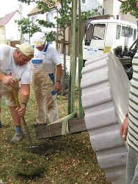 Danach ging es darum, die Vorgaben vom Garten- und Friedhofsamt von Erfurt zu erfüllen. Ein Drainageloch wurde unter der Achse ausgehoben, in welches Kies gefüllt wurde. Dieser sollte ein schnelleres Versickern des Regenwassers ermöglichen und damit Fäulnis vorbeugen.