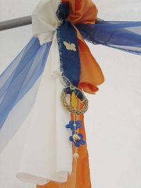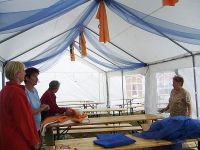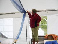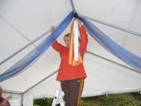 Am Tag vor dem Fest galt es die Zelte auszuschmücken. Nicht wie sonst wurden Luftballons für den Schmuck verwendet, sondern lange Bänder aus blauem Organza und Schleifen aus creme-farbenem und orangem Taft.