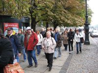 Links davon führte uns unser Weg am neu eröffneten Neuen Museum vorüber, vor deren Kassen-Container sich bereits eine Menschenschlange gebildet hatte. Sie hatten sich dort eingereiht, um einen Blick auf die berühmte Büste der Nofretete zu werfen, die seit einer Woche wieder an ihrem angestammten Platz stand, den sie vor siebzig Jahren kriegsbedingt verlassen musste. Glücklicherweise hatten wir "Zeitfenster" gebucht und wussten, dass wir von 13.00 bis 13.30 Uhr ohne uns anstellen zu müssen in das Neue Museum eingelassen werden würden.
