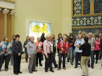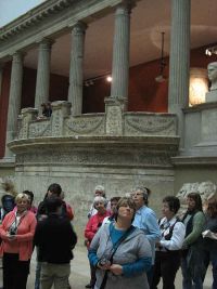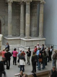 Gleich gegenüber des Tores war ein anderes steinernes Monument zu sehen, das Grabmal aus Falerii, ebenfalls in römischer Zeit entstanden. Wir stiegen hinauf auf die Plattform des Grabmals und hatten von dort einen herrlichen Blick auf das auf der anderen Seite stehende Markttor. Unterhalb des Grabmales war eine Sitzstatue eines römischen Kaisers zu sehen, der man den Kopf des Trajan aufgesetzt hatte. Wir verließen diesen Saal durch das Markttor von Milet und betraten einen anderen durch das berühmte Ischtar-Tor.