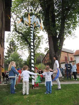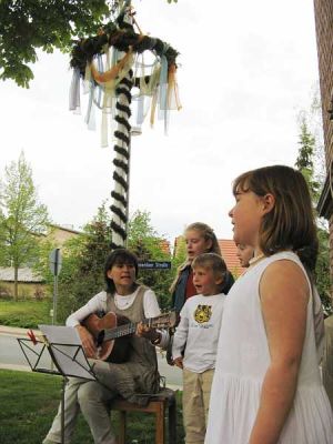 Unmittelbar nachdem der Baum stand und die Bänder am Kranz wehten, sangen die Hochstedter Knirpse über den Frühling und über den Mai.