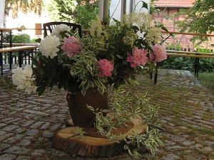 In der Mitte der Zelte stand ein großer Sommerblumenstrauß und auf den Tischen kleine Sträußchen. Schon im Mai waren Einladungen an Nicht-Vereinsmitglieder herausgegangen, da wir uns auf diesem Weg für ihre Hilfe bedanken wollten.