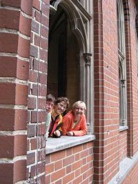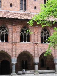 Wir fanden uns daraufhin in einem quadratisch angelegten Schlosshof wieder, welcher von Arkadengängen umschlossen wurde. In der Mitte stand ein Brunnen mit einem Pelikan auf der Spitze seines Runddaches. Anhand eines Bildes in einem der Arkadengänge konnte man die Zerstörungen der Anlage nach dem zweiten Weltkrieg erkennen und die Anstrengungen Polens, die Marienburg wieder aufzubauen. Hier im Hochschloss besichtigten wir die Burgküche und auch den Rittersaal mit den in die Wand eingelassenen Holzbänken.