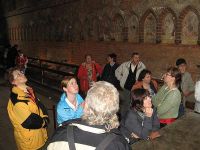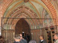 Von dort ging es zu einem Teil der Burganlage – der Marienkirche – welcher noch nicht wieder aufgebaut worden war. Im Inneren konnte man anhand historischer Fotografien und der vorhandenen Trümmer sehen, wie prachtvoll der Kirchenraum einst gewesen sein musste. An der Außenwand der Kirche stand einst in einer Niesche die mehrere Meter hohe Marienfigur, welche völlig zerstört worden war. Man ist gegenwärtig am überlegen, diese Figur nachzubauen, hat aber durch die ungenügende Tragkraft des wieder errichteten Mauerwerks bedenken, die Figur aus Stein dort erneut zu integrieren. Wir erinnerten uns, dass wir im Vorbeigehen ein von außen an dieser Stelle aufgehangenes großes Plakat mit der historischen Skulptur gesehen hatten.