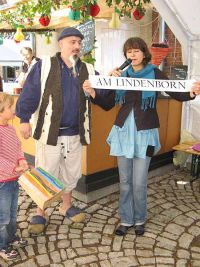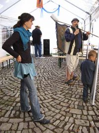 Frau Minelli hatte unterdessen am Museum ihre kleine Färberwerkstatt aufgebaut und zermahlte das Waidpulver für den Färbeprozess. Das Waidfest hatte unterdessen schon den nächsten Programmpunkt erreicht. Das Duo Liedfass nahm Aufstellung, um mit "Zerrwanst" (Akkordeon) und Geige das Publikum zum Mitsingen und Mitschunkeln zu animieren.