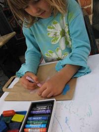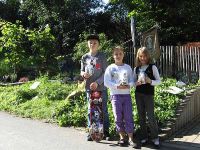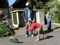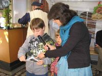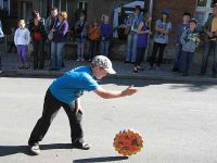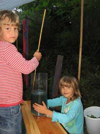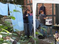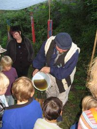 Generation - DJ Jörg - baute seine Anlage auf. Die Zeit wurde mit einer Demonstration des Waidbauern überbrückt, der zeigte, wie aus frischen Waidblättern Farbstoff gewonnen werden konnte. Die Kinder und auch die Erwachsenen waren begeistert bei der Sache und stellten interessiert Fragen über Fragen. Sie rührten mit eigenen Händen die Brühe, die mit Natron versetzt worden war und konnten so beobachten wie sich das Wasser langsam von gelblich in bläulich verfärbte.