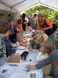 Kinder beim Bemalen von Porzellangeschirr und Papiertüten |