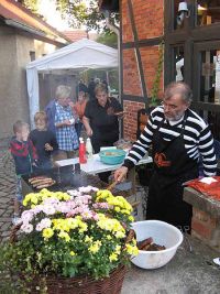 Weitere Gäste waren inzwischen angekommen, die wir am letzten Wochenende beim Rohrborner Waidmühlenfest getroffen und eingeladen hatten: Die Blaudruckermeisterin Sigritt Weiß mit ihrem Mann. Wir hatten uns vor einigen Jahren beim Besuch in der Erfurter Blaudruckerei kennengelernt.