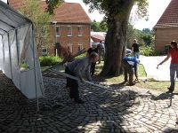 Hauswand des Bürgerhauses und den Stamm der Kastanie passen. Das klingt jetzt zwar relativ kompliziert, war es aber nicht - oder doch? Beide Zelte standen irgendwann richtig und mit geraden Seitenwänden nebeneinander. Wir waren zufrieden. Probleme bildete dann das dritte Zelt, das wo jetzt die flachen Giebelwinkel des Achter-Zeltes eingearbeitet werden mussten. Am Ende des Aufbau-Prozesses war der rückwärtige Teil dieses Zeltes breiter als der vordere, weil eben dort die flacheren Winkel als Seitenwinkel eingefügt waren.