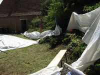Der Aufbau der Zelte für das Waidfest erfolgte ab dem 1. September. Der Wetterdienst hatte für die kommenden Tage Regenschauer angesagt und wir wollten, dass zumindest der Boden - der ja zum Teil aus Grasfläche besteht - einigermaßen trocken war. Was eigentlich mittlerweile Routine sein sollte - der Zeltaufbau - entpuppte sich doch als relativ schwierig. Das Problem lag einfach darin, dass unser Acht-Meter-Zelt schräge Zeltwände aufwies, die durch die Giebel-Winkel hervorgerufen wurden. Diese flacheren Winkel sollten durch gekrümmtere vom Zehn-Meter-Zelt ersetzt werden. Damit würden Achter- und Zehnerzelt nebeineinander zwischen