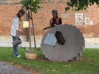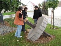 Es ging dann hinüber zum Waidstein, der in einer neuen Szene von zwei Vereinsmitgliedern gepflegt werden sollte. Wir hatten im Frühjahr neben dem Stein eine Pflanzschale aufgestellt, in welcher Waid ausgesät worden war, der sich nun allerdings nur im Mini-Format zeigte. Yvonne Weber sollte diesen Waid Gießen - zuvor am Brunnen Wasser in eine Kanne pumpen - während Monika Klimat die Tafel am Stein Putzte.
