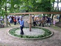 Als wir den Dorfplatz erreichten, drehte sioch dort bereits unter Beobachtung der Kamera vom MDR, der von einem Pferd gezogene Waidstein. Gerlinde Gose, die Vereinsvorsitzende der Rohrborner Dorfgemeinschaft war schnell unter den Zuschauern ausgemacht. Wir begrüßten uns und übergaben ihr eine Tasse mit dem Motto unseres diesjährigen Waidfestes: Unkraut jäten. Die Tasse war gefüllt mit Waidsamen, auf dass dieser in Rohrborn nie ausgehen solle.
