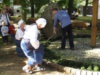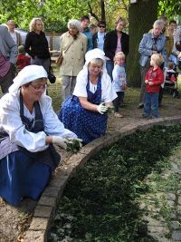 Unterdessen war der Waid in der Mühle zu Mus gemahlen und zwei Frauen der Rohrborner Dorfgemeinschaft - Gerlinde Gose als Vorsitzende mit dabei - demonstrierten, wie Waidballen geformt wurden.