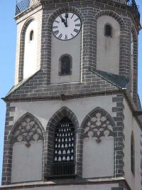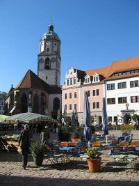 Wir umrundeten durch eine kleine Gasse die Frauenkirche und betraten das Gebäude. Bei der Frauenkirche handelte es sich um einen gotischen Hallenbau, der 1457 geweiht wurde. Der Flügelaltar zeigte die Marienkrönung und die Grablegung Christi. Über uns war ein Kreuzgewölbe zu sehen und auf der dem Altarraum gegenüber liegenden Empore eine Orgel. Die Besonderheit der Kirche befand sich jedoch im Turm. Wir hatten auf dem Markt bereits eine Kostprobe vom Glockenspiel der Frauenkirche zu hören bekommen. Die Glocken stellten eine Besonderheit dar, waren sie doch aus Meißner Porzellan hergestellt. Täglich erklingen zu verschiedenen Tageszeiten sechs verschiedene Choräle.