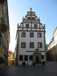 Auch ein altes Apothekergebäude, in der Mitte des 16. Jahrhunderts erbaut, stand am Markt,. Ebenfalls mit einem herrlichen Eingangsportal ausgestattet, machte es auf sich aufmerksam. Das Portal war mit dorischen Säulen und Inschriften von Hippokrates und Cicero verziert. Über dem Portal war ein Relief angebracht, welches den Fall des Ikarus zeigte.