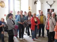 Wir hatten für 15.30 Uhr eine Führung gebucht, die uns das Schloss näher bringen sollte. Pünktlich zur vereinbarten Zeit begann der Rundgang und die Frau, die uns zur Seite stand dirigierte uns über ein Treppenhaus in einen hohen Saal, dessen Wände voller Jagdtrophäen hingen.