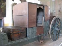 Die Führung war hier am Festsaal beendet und wir konnten uns entscheiden, entweder noch einen Blick auf die Sonderausstellung im Obergeschoss zu werfen oder gleich das im Erdgeschoss gelegene Federzimmer aufzusuchen. Die Sonderausstellung war Tierpräparaten gewidmet und die Mehrheit der Mitglieder der Reisegruppe wollte das Federzimmer sehen und anschließend auf der Schlossterrasse einen Kaffee trinken. So stiegen wir die Stufen der Freitreppe herab und gelangten in einen großen Raum, in dem eine Reisekutsche ausgestellt war.