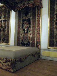Gleich daneben betrat man das Federzimmer, dessen Schatz mit einer Glasscheibe geschützt war, so dass nur wenige Besucher zusamen hinter die Tür treten konnten. Es war schon beeidruckend, welche Kunstfertigkeit hier gezeigt wurde. August der Sarke hatte 1723 das kostbare Paradebett mit Baldachin und Vorhängen in London erstanden. Nach seiner Rückkehr ließ er die Vorhänge zu Wandteppichen umarbeiten und schuf somit das Federzimmer. Millionen kleiner Federn warden auf einen Untergrund geknüpft worden. Mit ihrer Farbenvielfalt und unterschiedlicher Beschaffenheit wurden einzigartige Federornamente geschaffen.