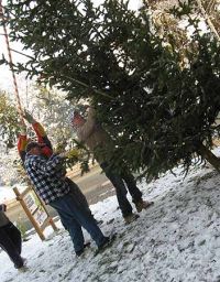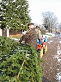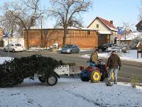Unterdessen hatte es geschneit und eine dünne Schneedecke hatte sich über den Baum gelegt. Trotzdem musste er auf den Traktoranhänger verfrachtet werden und die vielleicht dreihundert Meter zum Bürgerhaus gefahren werden.