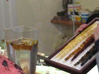 Erstaunt waren wir als der Meister uns erklärte, dass Bernstein in starkem Salzwasser schwimmt. Er demonstrierte die Schwimmfähigkeit des Bernsteins mithilfe eines Wasserglases.