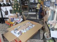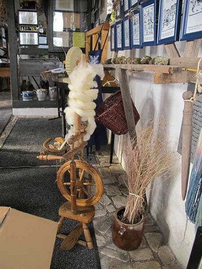 Das große Paket war schnell ausgepackt und das Exponat aufgestellt und mit Rohwolle dekoriert, wir hatten nämlich ein antikes Spinnrad erstanden. Damit es Frau Stange nach der Scheckübergabe enthüllen konnte hatten wir es nach dem Auspacken mit einem Tuch verhangen.