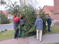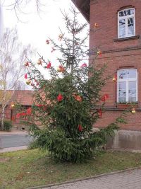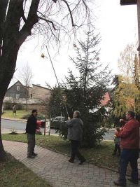 Im Bürgerhaus war unterdessen der Brotschmier-Marathon zum Ende gekommen und zusammen mit den Pfeffertafeln für den Verzehr angerichtet worden.Nach und nach waren auch weitere Hochstedter eingetroffen, die sich wunderten, dass die Baum-Aufstellarbeiten schon so weit gediehen waren. Jetzt gingen wir nämlich schon dazu über, die Kugeln aufzuhängen und damit die Arbeiten am Baum fast gänzlich abzuschließen.