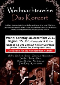 Auch im Jahr 2011 gab es in Hochstedt wieder ein weihnachtliches Konzert. Am 4. Advent (18. Dezember) hatten die Ortsteilbürgermeisterin, der Ortsteilrat, die Hochstedter Vereine und die Kirchengemeinde zum Konzert in die Hochstedter Pankratiuskirche eingeladen. Das Konzert stand unter dem Motto einer "Weihnachtsreise". Auf diese begaben sich die Sängerin Sylvia Weisheit-Heinze, Steffen Heinze am Piano, Wieland Götze am Schlagzeug sowie Uwe Rapp am Kontrabass und wollten alle ihre Gäste mit sich nehmen.