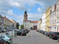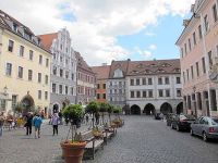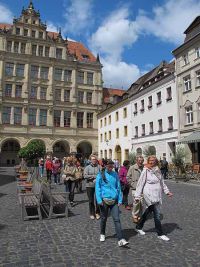 Von hier gelangten wir zum Untermarkt. Auch hier beeindruckten die farbigen und verzierten Fassaden. Der Flüsterbogen, das Portal eines der Bauten musste selbstverständlich ausprobiert werden. Während man auf der einen Seite flüsterte konnte man auf der anderen Seite des Bogens alles hören. Das Haus daneben beeindruckte mit seinen astronomischen Sonnenuhren. Frau Ott zeigte uns Bilder, wie Görlitz vor 1989 ausgesehen hatte, wie verfallen und grau alles aussah. Man wollte sogar große Teile der historischen Stadt abreißen, um Platz für Plattenbauten zu schaffen. Die politische Wende war für Görlitz eine glückliche Fügung, die Häuser wurden restauriert und strahlen nun größtenteils in altem Glanz. Seit einigen Jahren dient Görlitz sogar als Kulisse für Filmproduktionen - auch aus Hollywood.