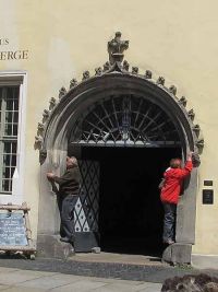 An der Fassade befindet sich ein Relief mit dem Stadtwappen von Görlitz, das einen doppelschwänzigen, böhmischen Löwen und den Reichsadler zeigt. Beide Wappentiere halten die Kaiserkrone in ihrer Mitte. Gerahmt wird das Wappen von spätgotischen Verzierungen und den Heiligenfiguren der Maria mit dem Kind sowie der Barbara, mit dem Turm als Schutzpatronin der Stadt. Von dort ging es wieder zurück zum Oberen Markt, wo uns, in der Eingangshalle eines der dort stehenden Häuser, Frau Ott die ungewöhnlichen Görlitzer Hallenhäuser erklärte, die man nur hier antrifft. Kennzeichnend für den Bautyp sind die großen Hallen, die das Haus in verschiedene Zonen und Bereiche unterteilen. Hier wurde gehandelt und mit der großzügigen Bauweise gezeigt und demonstriert, was man hat. Die meisten dieser Häuser entstanden im 14. und 15. Jahrhundert.