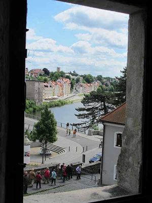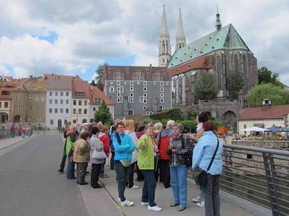 Beachtenswert waren auch die evangelischen Beichtstühle, die barocke Pracht verkörperten, wie auch der Altar. Von der Peterskirche gingen wir hinunter zur träge dahinfließenden Neiße. Dort machten wir noch ein Gruppenbild mit dem Waidhaus im Hintergrund, bevor wir deutschen Boden verließen, denn über die Neiße hatte man eine Brücke gebaut, die Görlitz mit dem polnischen Zgorzelec verbindet. Von der Mitte der Brücke aus, hatte man einen herrlichen Blick auf die Altstadt mit Peterskirche und Waidhaus. Auf dem Asphalt der Brücke war eine gebogene gelbe Linie aufgemalt, die, wie Frau Ott erzählte, den 15. Meridian (östliche Länge) markieren soll, der hier mitten durch die Stadt geht.