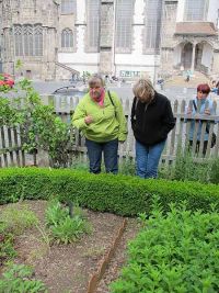 Hier gab es historische Nutz- und Heilpflanzen zu sehen, aber auch solche, die zum Färben genutzt wurden, wie Waid, Saflor, Knöterich und Krapp. Dr. Sander, der Vereinsvorsitzende, und eine weitere Frau vom Verein begrüßten uns und erklärten die einzelnen Teile des Gartens. Dabei wurde gerochen, geschmeckt, gefühlt und gestaunt.