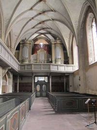 Unsere vorerst letzte Etappe mit Frau Ott in Görlitz war eigentlich schon erreicht: Die mächtige Peterskirche auf der anderen Seite des kleinen Platzes. Wir betraten die fünfschiffige Kirche die ab dem 13. erbaut worden war über eine Treppe. Die Bauzeit hatte sich bis zum Ende des 19. Jahrhunderts mit der Fertigstellung der Türme hingezogen. Die Kirche ist mit einer Länge von 72 Metern und einer Breite von 39 Metern die größte spätgotische Hallenkirche Sachsens. Frau Ott wies uns auf die überaus prächtige Sonnenorgel hin, deren Name sich von den strahlenförmig angeordneten Orgelpfeifen am Prospekt herleitet. In ihrer Art stellt sie damit ein einzigartiges Musikinstrument dar. Frau Ott meinte aber, dass Bach damals nicht sonderlich vom Klang der Orgel beeindruckt war. Heute klingt das Instrument jedoch anders, da die Orgel in den 1990er Jahren ein neues Innenleben bekommen hatte.