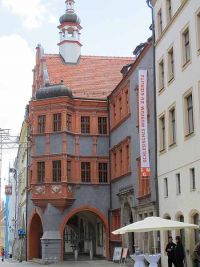 An der Fassade befindet sich ein Relief mit dem Stadtwappen von Görlitz, das einen doppelschwänzigen, böhmischen Löwen und den Reichsadler zeigt. Beide Wappentiere halten die Kaiserkrone in ihrer Mitte. Gerahmt wird das Wappen von spätgotischen Verzierungen und den Heiligenfiguren der Maria mit dem Kind sowie der Barbara, mit dem Turm als Schutzpatronin der Stadt. Von dort ging es wieder zurück zum Oberen Markt, wo uns, in der Eingangshalle eines der dort stehenden Häuser, Frau Ott die ungewöhnlichen Görlitzer Hallenhäuser erklärte, die man nur hier antrifft. Kennzeichnend für den Bautyp sind die großen Hallen, die das Haus in verschiedene Zonen und Bereiche unterteilen. Hier wurde gehandelt und mit der großzügigen Bauweise gezeigt und demonstriert, was man hat. Die meisten dieser Häuser entstanden im 14. und 15. Jahrhundert.