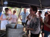 Unter dem Dach des Pavillons war es angenehm mild, weil wir unter hohen Bäumen standen, die Schatten spendeten. Die Temperaturen dieses Tages waren insgesamt recht hoch und der Hochsommer zeigte sich mit heißer Wucht. Weit über dreißig Grad waren angesagt und wurden auch erreicht, als das Rohrborner Fest um 14.00 Uhr begann. Die Pferde bereiteten einige Schwierigkeiten zur Mühle zu gehen und sich gehorsam vor den Mühlstein spannen zu lassen. Aber die Rohrborner schafften das und rumpelnd setzte sich der mächtige Rohrborner Waidstein in Bewegung und zermalmte unter sich den Waid. Zahlreiche Gäste und Rohrborner waren bereits eingetroffen und tummelten sich zwischen den verschiedenen Ständen, unter dem Dach des Festzeltes, am Kaffeestand oder am Getränkewagen.