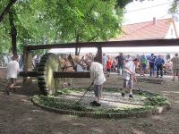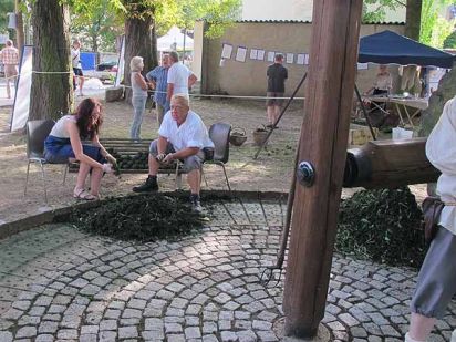 Zwischendurch gab es immer mal wieder Schauvorführungen mit der Waidmühle. Von unserem Stand aus brauchten sich die Festbesucher ja nur umzudrehen, um dabei zusehen zu können. Unsere Gruppe hatte es sich einstweilen auf der Holzbank neben dem Färberstand gemütlich gemacht und verfolgte von dort die Runden, die das Pferd mit dem Stein drehte.